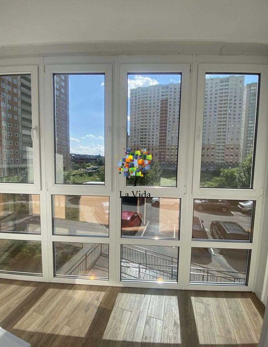 Великий, довгий, засклений, утеплений балкон на всю протяжність квартири, з коморами та панорамни вікнами, довжиною 9 м.